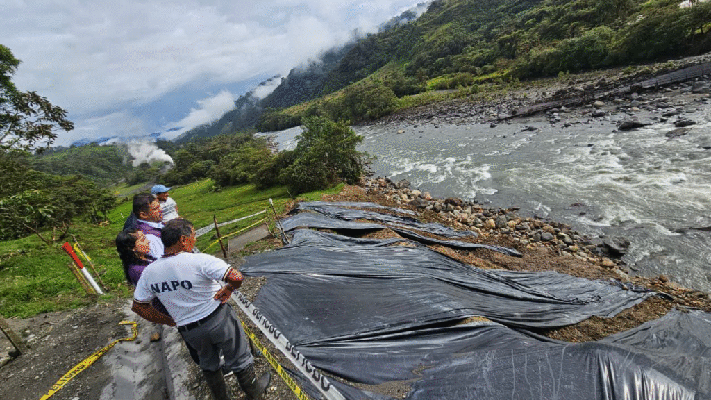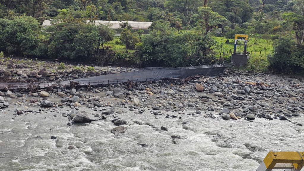 El gobernador de Napo, Gary Rivadeneyra, recorrió el sector Logma Playa, en la parroquia Cosanga del cantón Quijos, para constatar los daños causados por el fuerte temporal, que destruyó un puente peatonal y dejó incomunicadas a 18 familias de la zona.