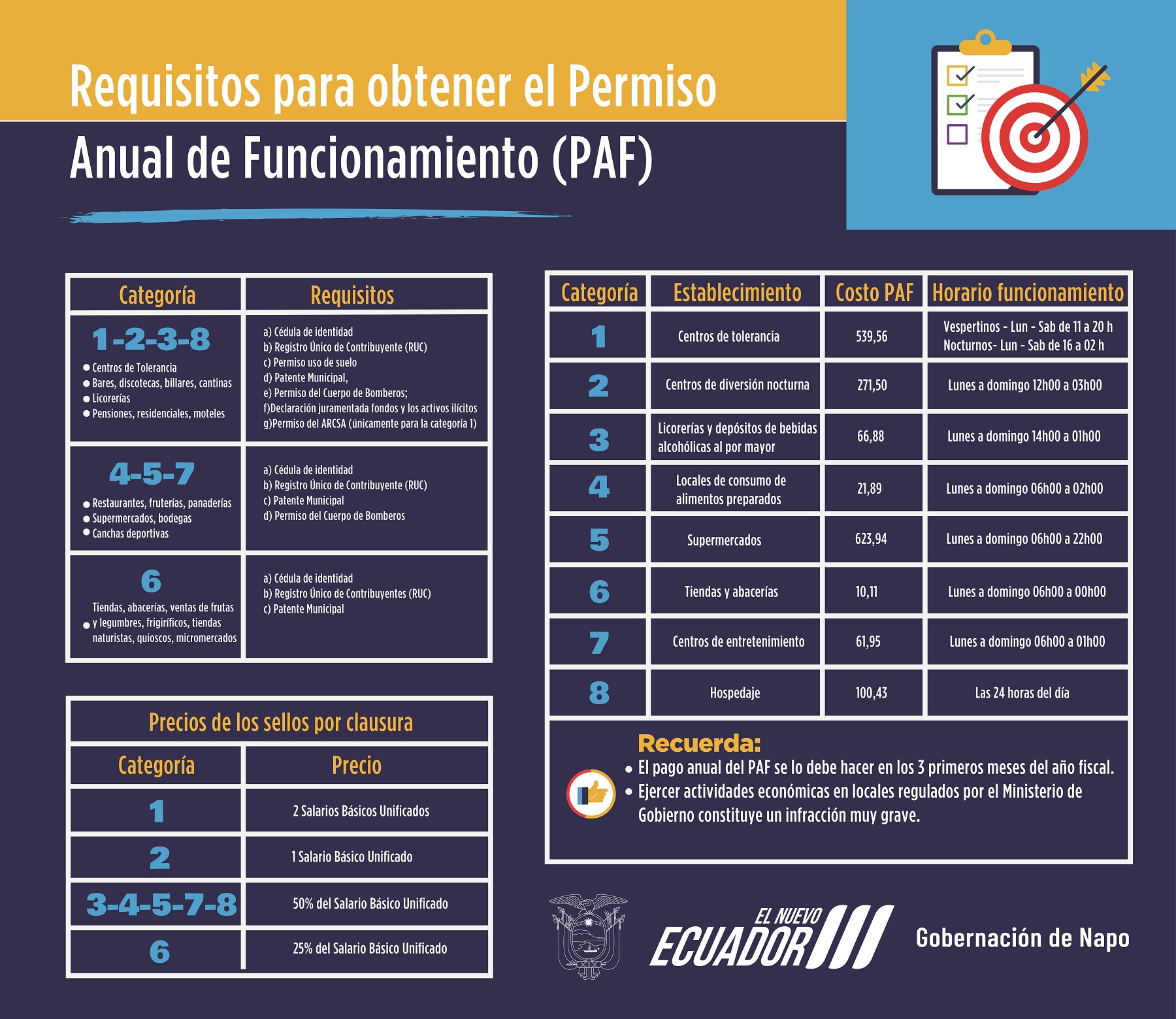 El Permiso Anual de Funcionamiento (PAF) es un documento público obligatorio emitido por el Ministerio de Gobierno de Ecuador, a través de las Intendencias de Policía. Autoriza el funcionamiento de establecimientos comerciales, restaurantes y locales que expenden alimentos o bebidas alcohólicas, con vigencia de un año fiscal y renovación anual.